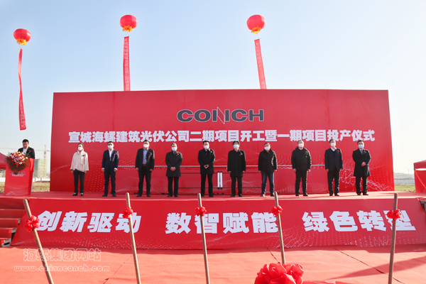 2022年12月15日,宣城海螺建筑光伏公司二期項(xiàng)目開工暨一期項(xiàng)目投產(chǎn)儀式在宣城舉行。宣城市委書記孔曉宏,市委副書記、市長何淳寬,海螺集團(tuán)黨委書記、董事長楊軍出席儀式。宣城市政府秘書長鄭華、市委副秘書長李壽生、經(jīng)開區(qū)黨工委書記黎斌,海螺水泥總經(jīng)理李群峰,海螺環(huán)保總經(jīng)理李曉波,海螺新能源總經(jīng)理馬偉,股東代表褚衍玲、徐曉華,以及宣城市直有關(guān)單位和經(jīng)開區(qū)負(fù)責(zé)人、行業(yè)嘉賓、施工單位代表參加了儀式。