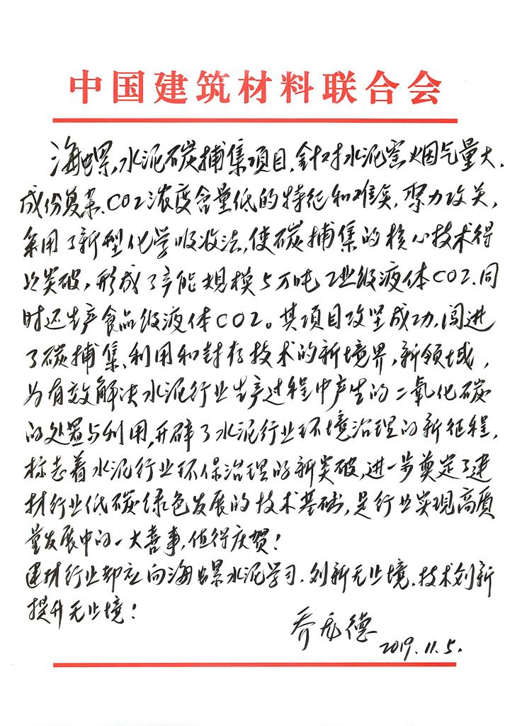 2019年11月5日,中國建筑材料聯(lián)合會會長喬龍德致信海螺集團(tuán),對海螺水泥碳捕集項目給予高度評價,表示慶賀,號召建材行業(yè)向海螺水泥學(xué)習(xí)。