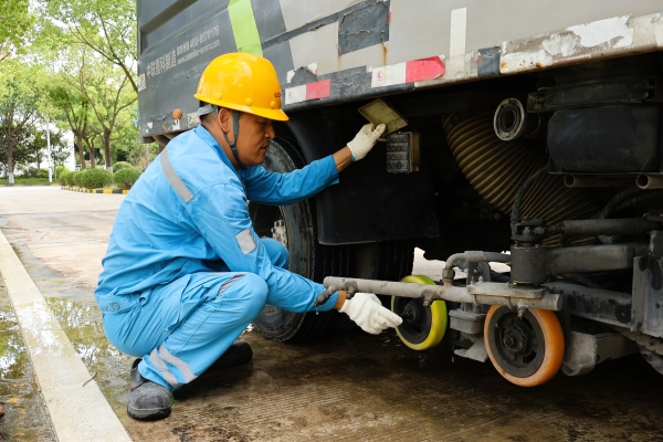 早上六點(diǎn)多,清掃車駕駛員陶師傅對車況進(jìn)行了例行檢查,即將開始廠區(qū)新一天的梳洗打扮。
