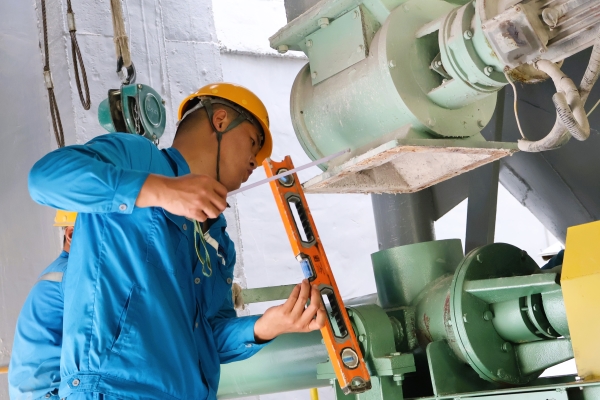 上午九點(diǎn),制成工段的維修工師傅們,正在對礦粉庫底鉸刀增加安裝螺旋秤。