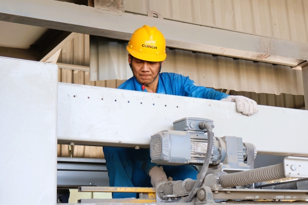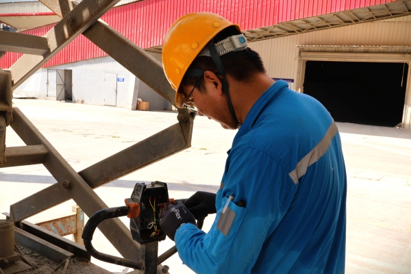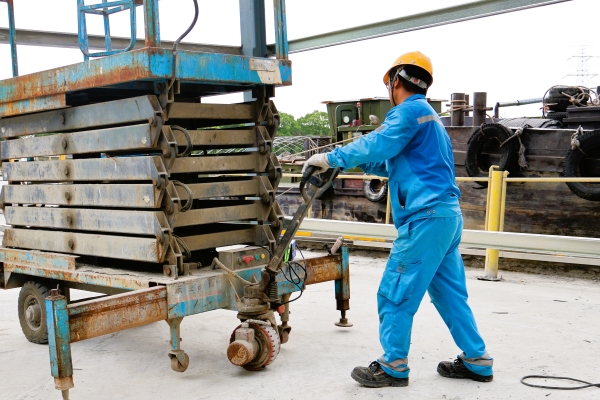 原材料卸貨碼頭,電修班的技術(shù)擔(dān)當(dāng)“雨哥”正在維修登高車電路,豆大的汗珠滾滾落下。