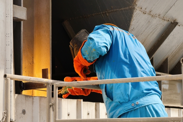 維修工魏師傅剛剛完成了船舶污染物接收管道支架焊接,藍(lán)色的工裝早已被汗水浸透。