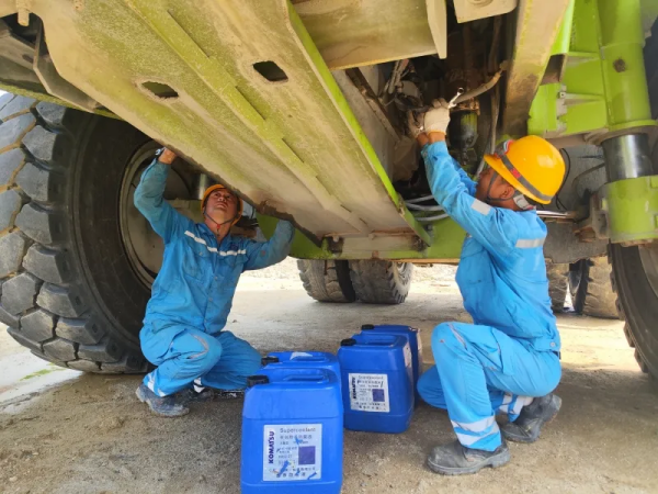 封開海螺楊會中、黃華成在對礦車進(jìn)行檢查維護(hù)