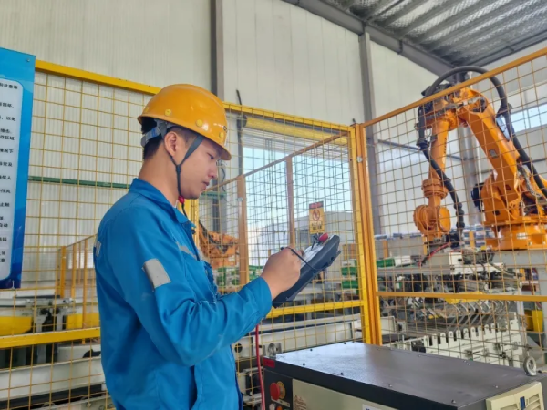 江門海螺陳家輝在對瓷磚膠碼垛機(jī)系統(tǒng)調(diào)試