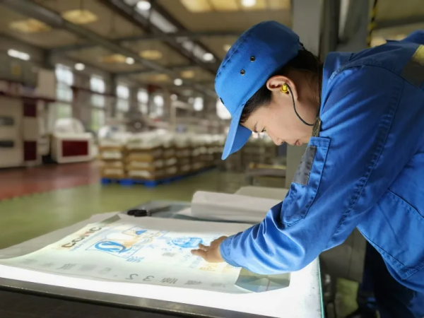 蕪湖海螺塑品施春愛正在對水泥包裝袋進(jìn)行檢驗(yàn)