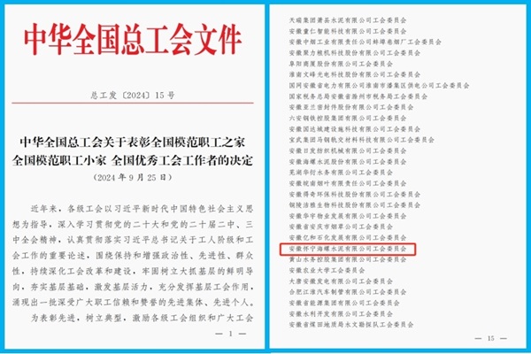 日前,中華全國總工會印發(fā)了《中華全國總工會關(guān)于表彰全國模范職工之家 全國模范職工小家 全國優(yōu)秀工會工作者的決定》,懷寧海螺公司工會獲“全國模范職工之家”榮譽稱號,這是繼“全國職工書屋”“全國安全文化建設(shè)示范企業(yè)”之后獲得的又一全國性殊榮。